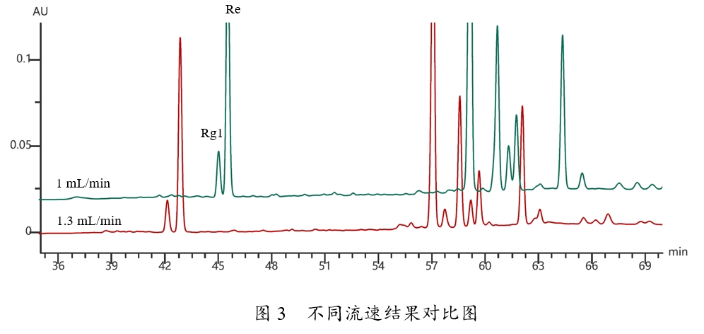 色譜分析中我們習慣根據K'改變后,化合物間相對保留行為是否改變將化合物分為“常規樣品”和“非常規樣品”。其中常規樣品是K'改變后,相對保留行為不發生改變,非常規樣品剛好相反。我們再回到這個實驗,發現色譜柱長度從150mm變為250mm后,Rg1和Re分離度變差,說明Rg1和Re屬于非常規樣品范疇。為了驗證這一結論,我們設計實驗,改變流速F,考察K'減小后Rg1和Re分離度是否也會變差。結果如圖3所示,我們發現1mL/min流速下分離度小于1.3mL/min,與色譜柱長度改變后得到的分離度變化趨勢一致。
