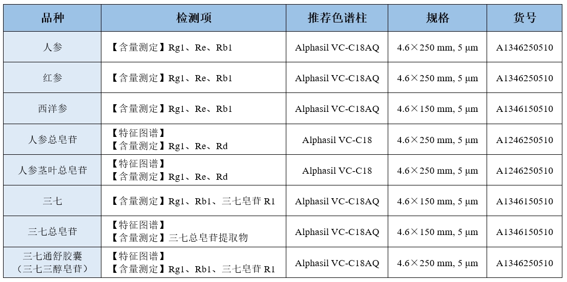 為了方便大家選擇合適的色譜柱,我們將藥典中人參皂苷的品種和對應的色譜柱匯總如下。